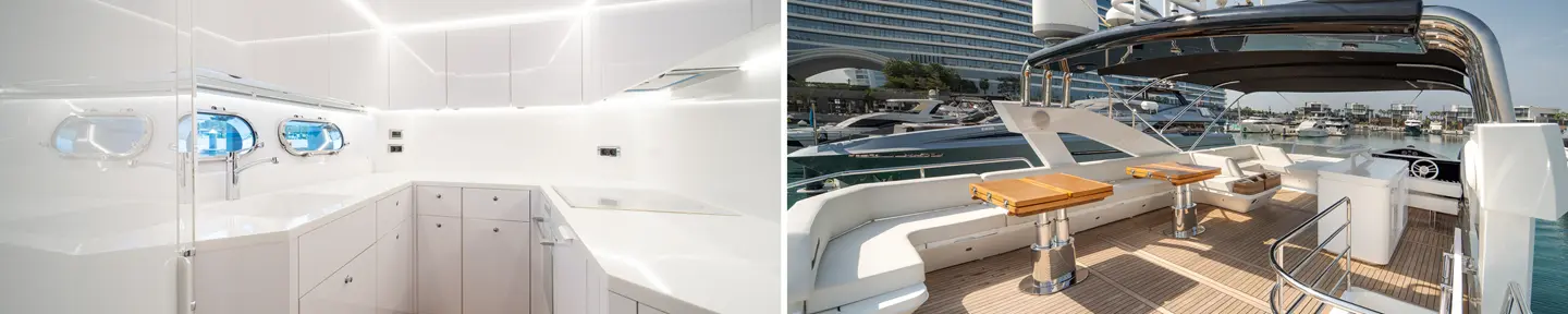 Jude had begun losing ground to newer charter listings. The aging paintwork, worn teak, dated kitchen setup, and older entertainment features reduced its impact in Dubai’s competitive charter market. Our refit focused on increasing Jude’s charter appeal through a restored exterior, upgraded guest-experience, and a complete interior rebuild designed for a luxurious escape at sea and the high-frequency demands of a new charter favorite.